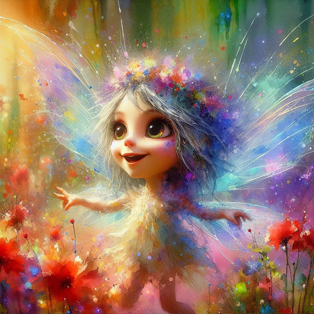 In a whimsical, watercolor landscape, Lirien, a playful forest sprite, dances among the vibrant, blooming flowers. The artistic 3D scene captures every delicate brushstroke and splash of color, as Lirien's translucent wings shimmer with iridescent hues, creating a mesmerizing, dream-like atmosphere. Her mischievous grin and sparkling eyes convey her lighthearted spirit, as she embodies the essence of joy and creativity. The extraordinary artistry of the portrait brings Lirien's captivating allure and enchanting nature to life, showcasing the innovative, awe-inspiring design of this never-before-seen sprite.