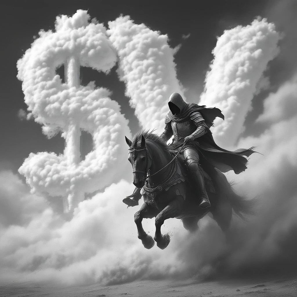 Photo of a ultra realistic Black and white art of a hooded knight riding his horse in full gallop, smoke around him, detailed, in the style of fantasy art, hyper-realistic. In the background is a huge word "$V" shaped in the cloud