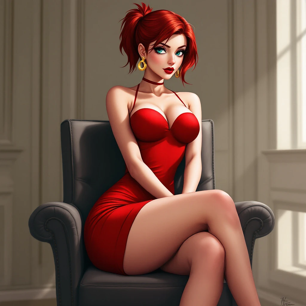 anime, woman, red hair, short ponytail, cyan eyes, red lips, red bodycon dress, tight dress, red high heels, round golden earrings, bare legs, closed cleavage, massive chest, bare arms, with straps, sitting on a chair, legs crossed