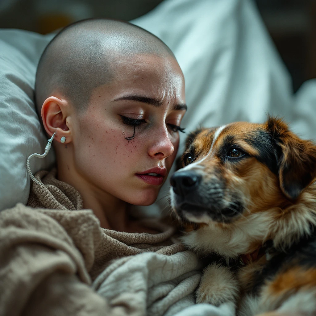 A heartwarming scene of a sad teary eyed bald young woman with breathing tubes and a dog sharing a moment of companionship