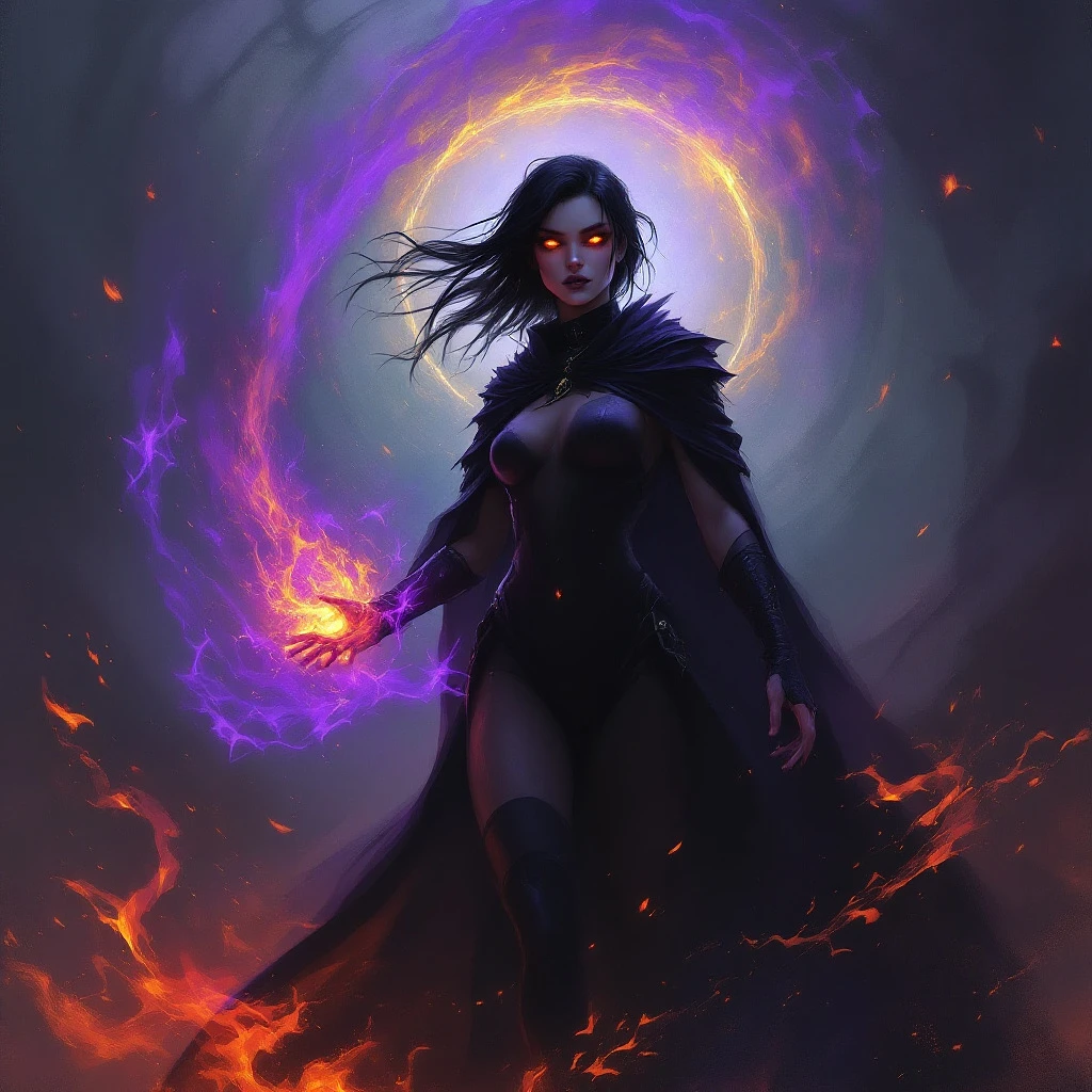 simple blurry painting in the style of warhammer 40k of a female druid, standing infront a gothic circh, channeling pruple and orange hellfire magic, cybereyes, black tight onepiece suit, mantle with high collar, black hair, latina skin