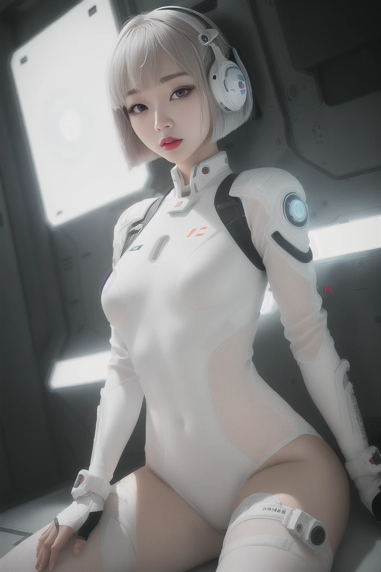 (1girl) , (full body) , (white futuristic sci-fi bodysuit) , Beautiful Korean woman, kpop idol, (Cute Loose Bob hairstyle) , symmetrical eyes, realistic, sharp focus, HD, highly detailed, intricate, photography, hyperrealism, hyperrealistic, film, studio portrait, detail, dramatic lighting, (red lips) , (small breasts)
