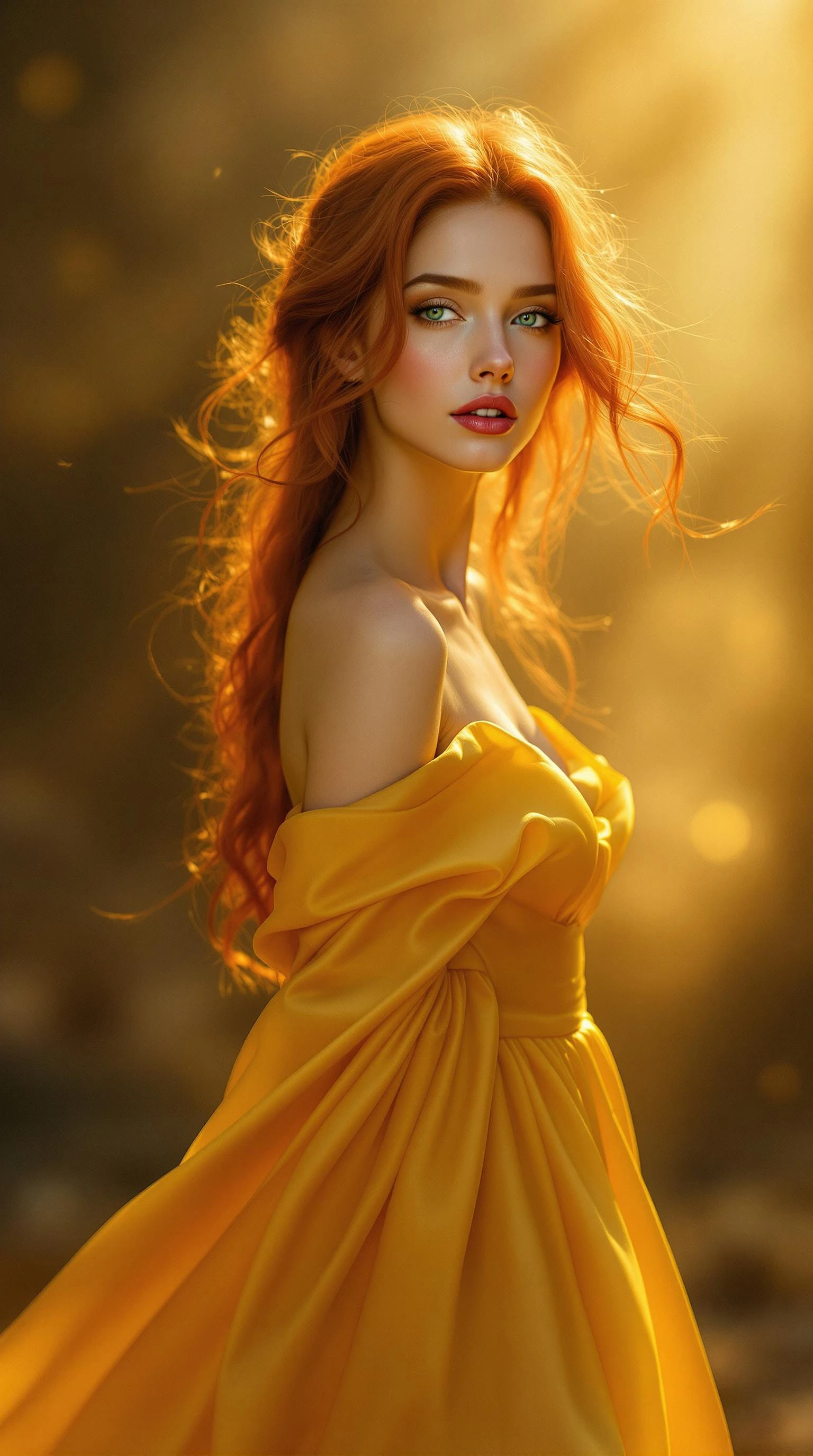 “Professional fine art photography full body vertical portrait, cinematic style, warm golden hour light, soft pastel colours. Copper red hair and Imperial full length deep yellow silk dress flowing upward, creating an ethereal atmosphere. Green blue silver grey eyes contrast with the reds. Deep shadows, soft highlights, dreamy haze. Vertical composition, emphasising graceful movement. Soft contrast, soft saturation. ”