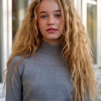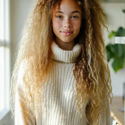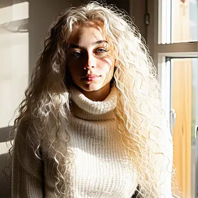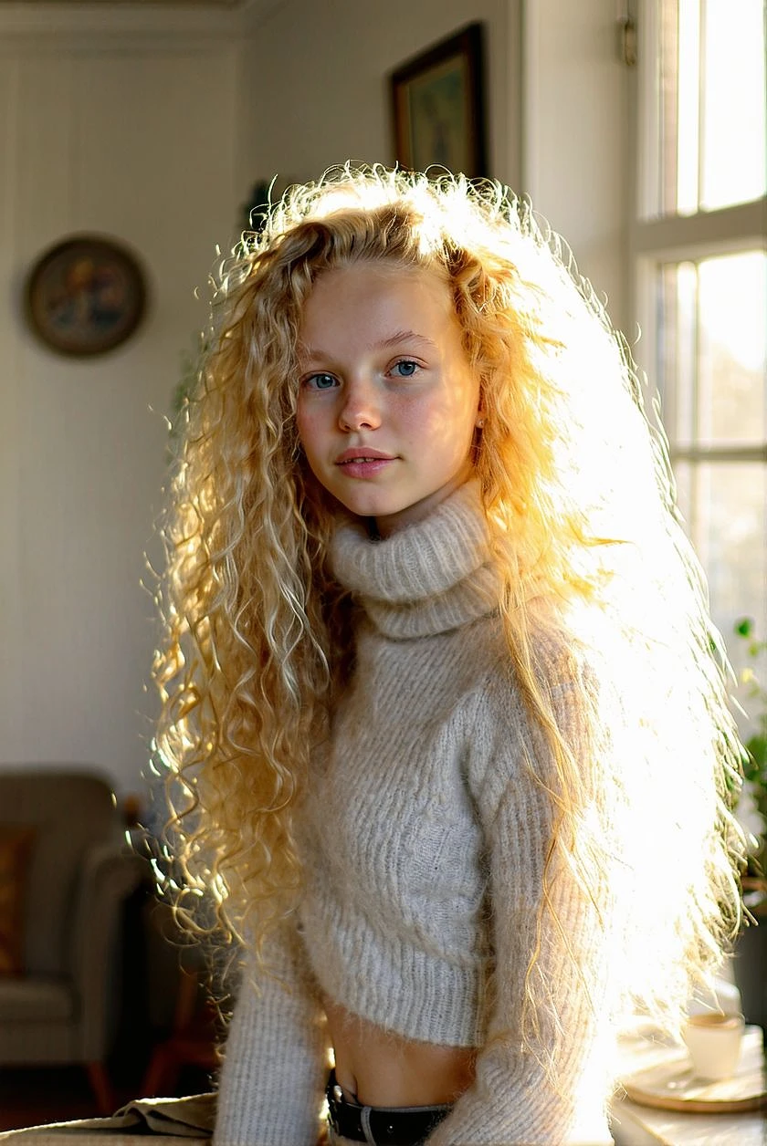 lovely girl with long blonde curly soft hair, wears a mohair turtleneck crop-top, morning sunlight in a Swedish house