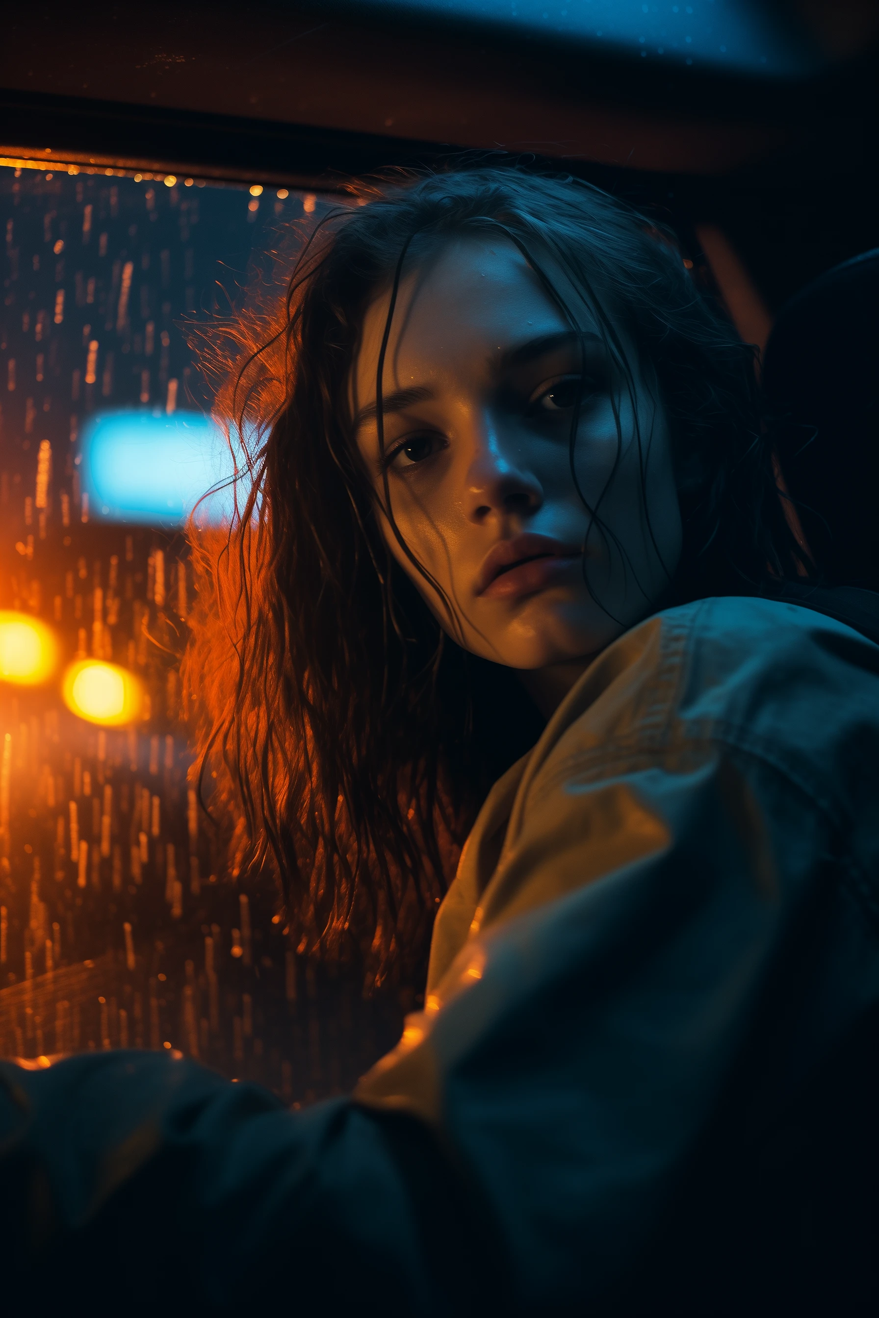 young woman inside a car in the rain, dark orange and blue, soft and dreamy, sky-blue and brown, rainy drops, neon lights street, night shot --ar 2:3