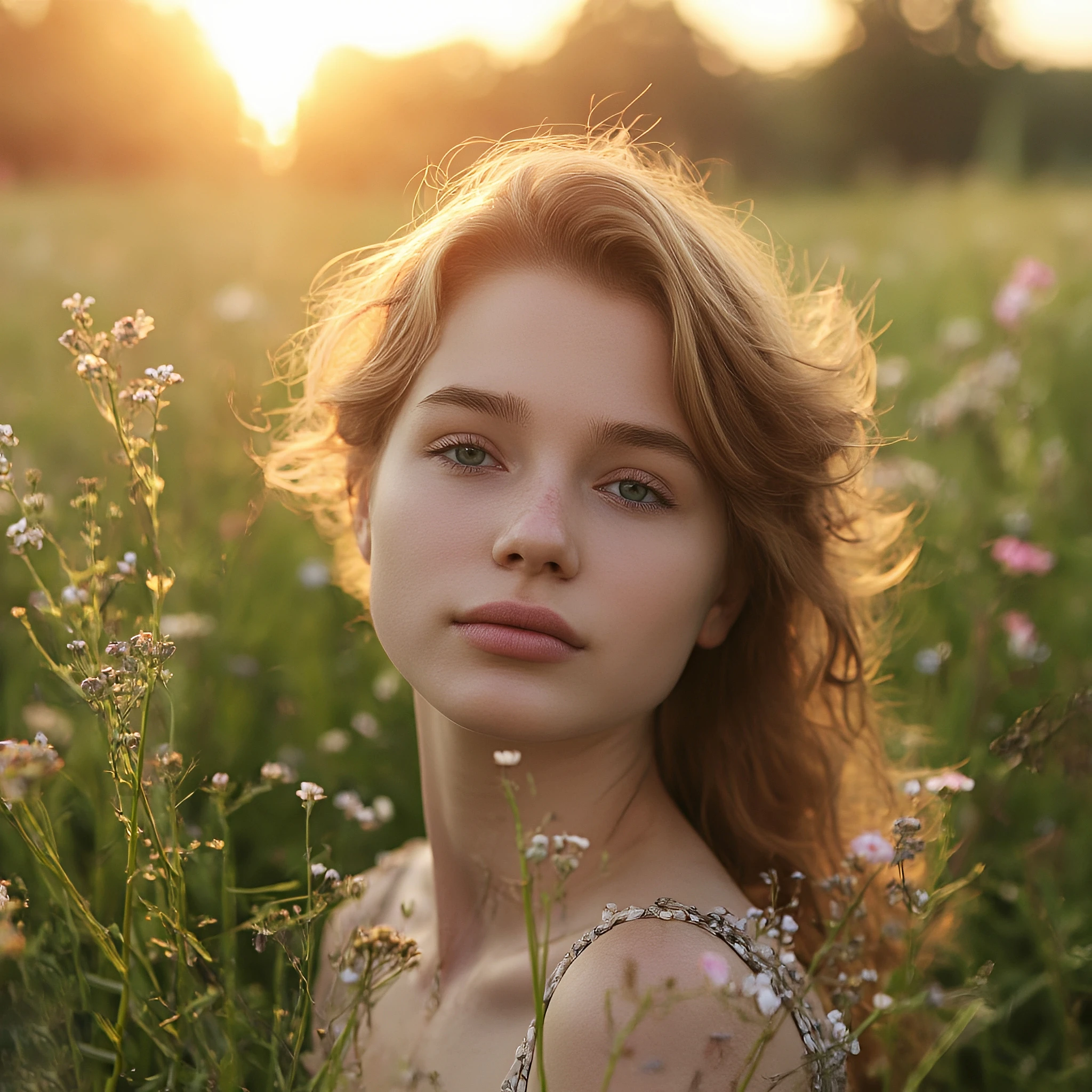 A young Swedish woman, 21 years old, with a strikingly elegant and natural beauty, her features accentuated by a pale, porcelain-like complexion, cascading chestnut-brown hair that flows in soft, flowing waves, and eyes that shimmer with a deep, emerald green hue, standing in a sun-drenched meadow at dawn, the golden light of morning casting long, ethereal shadows across the grass, her presence exuding a serene and timeless grace, surrounded by wildflowers in full bloom, the air filled with the gentle scent of fresh earth and blooming flora, the scene evokes a sense of peace and harmony with nature, capturing the essence of a young woman's natural beauty and the quiet majesty of a morning in the countryside.