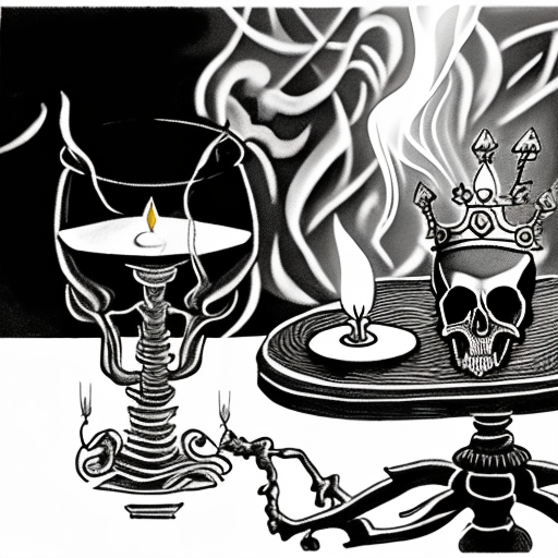 A minimalist black and white tattoo scene with an ornate table. On the table: a skull with a laurel crown, an elegant chandelier casting shadows, an open bottle of wine, and a half-full glass. Next to the table, a relaxed skeleton holding a lit cigarette with a light smoke trail. The skeleton is folded on itself showing tiredness, melancholy, fatigue,. The painting evokes feelings of nostalgia, delicate beauty, and a touch of melancholy. It invites the viewer to appreciate the transient beauty of the moment and it captures themes of life, death, and fleeting pleasures