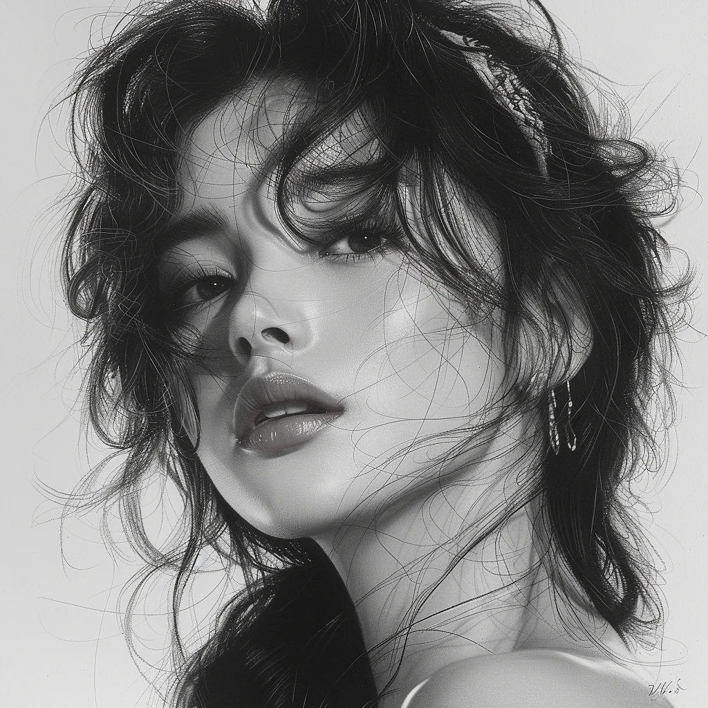 a beautiful drawing of a girl in black and white, in the style of gongbi, dark silver and light pink, soft realism, bombacore, hallyu, warmcore, celebrity portraits --ar 1:1 --stylize 750