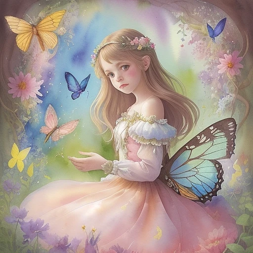 A beautiful girl in a fairy costume, surrounded by flowers and butterflies. Contents: watercolor painting. Style: Whimsical and delicate, like a children's book illustration.