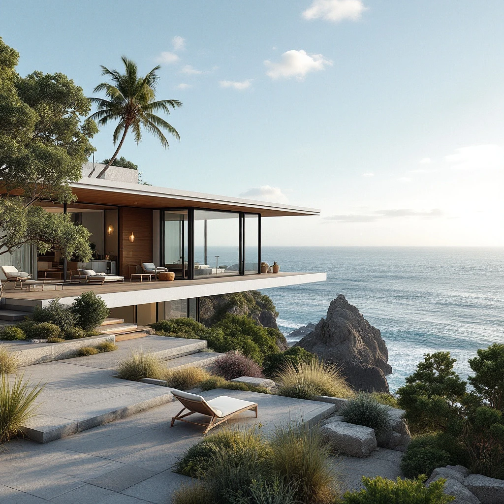 Hyper realistic eye level exterior photo of a mid century modern style house overlooking the ocean, daylight, indirect lighting, AD magazine, Frank Lloyd, Eames, Mies van der Rohe