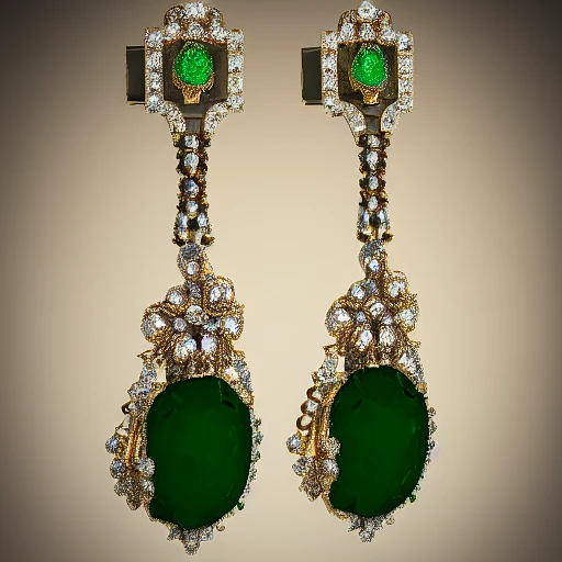 full display of baroque style jewelry design, a pair of earrings, green gemstones with four-leaf colver shaped diamonds, roses sharp, highly detailed vray render, flash