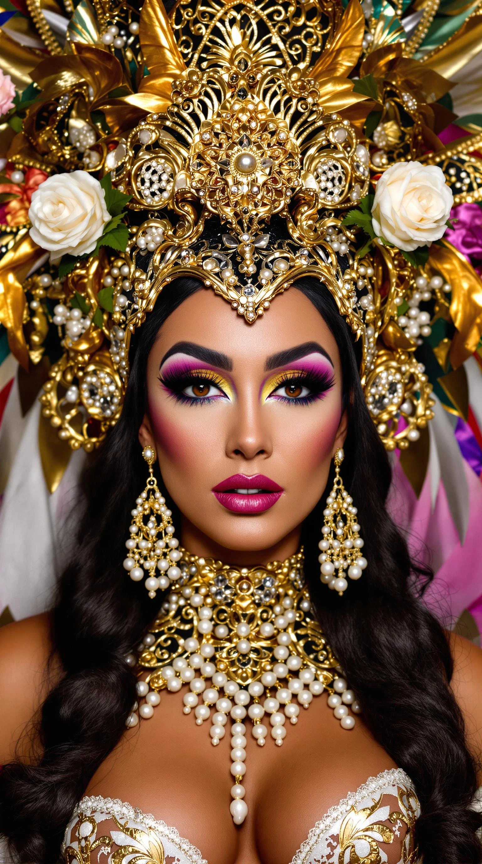 "Image is a highly stylised portrait featuring a carnival woman dancer with a striking and elaborate headdress. The headdress is ornate, adorned with intricate floral patterns and metallic elements, giving it a regal appearance. The subject has long, dark hair cascading down her shoulders, and her skin is a warm, medium tone. Her facial features are sharp and defined, with high cheekbones and full lips. She wears dramatic makeup, including bold, arched eyebrows and vibrant eyeshadow that accentuates her eyes. Large, decorative earrings and a matching choker necklace complement her attire, both featuring pearl-like embellishments and intricate lace designs. The overall composition is rich in detail, with a focus on elegance and opulence, creating a visually captivating and artistic image. "