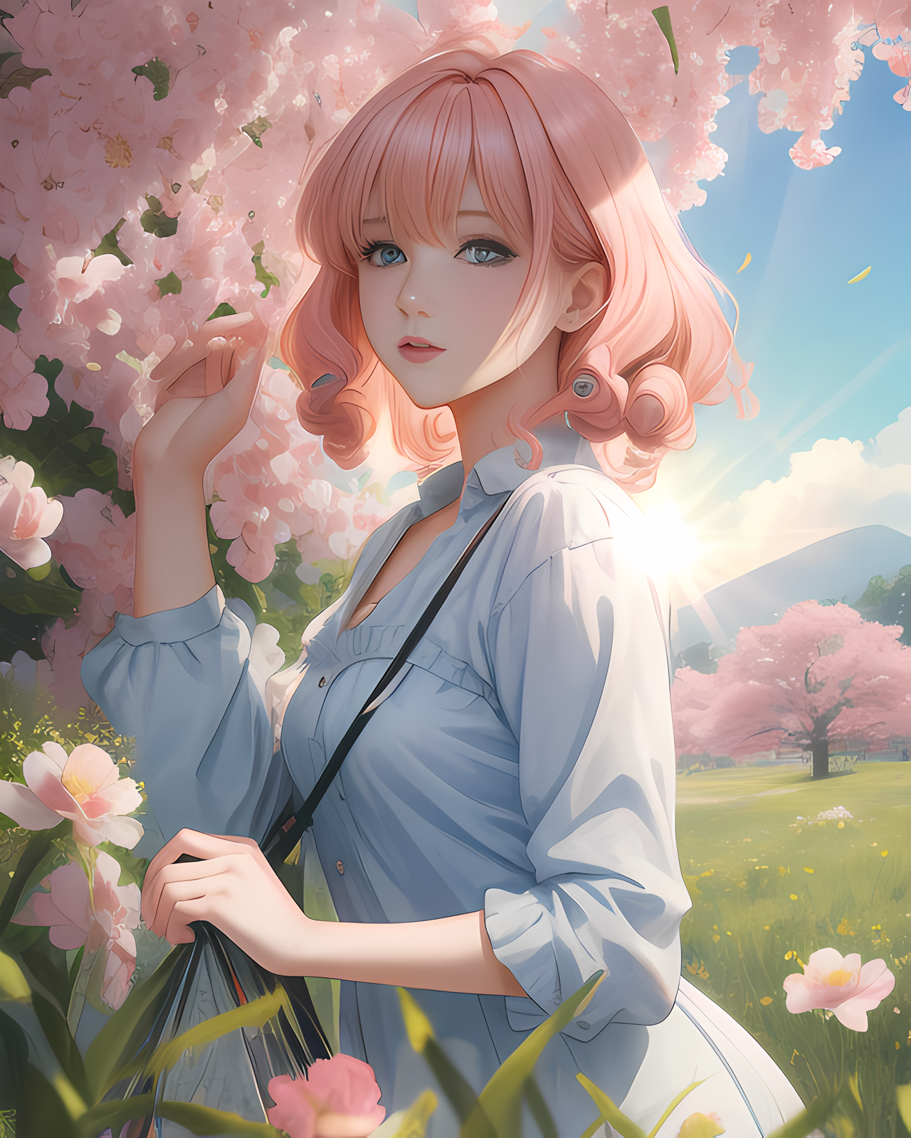 Stable Diffusion prompt: young woman in a meadow:: with hello kitty:: pink ...