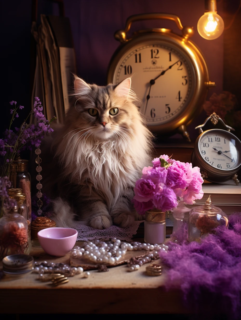 A table of photographs, clocks and a cat, in the style of light purple and light brown, soggy, single object, gemstone, thriftcore, dollcore, i can't believe how beautiful this is