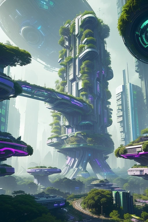 a view of a city with a lot of trees and bushes, garden, a lot of flying objects , future city, in fantasy sci - fi city, in a cyberpunk garden, utopian jungle in space, rainbow cyberpunk city, lush alien landscape, lush foliage cyberpunk, cyberpunk forest, cyberpunk dreamscape, cyberpunk in foliage with bridge connect together.