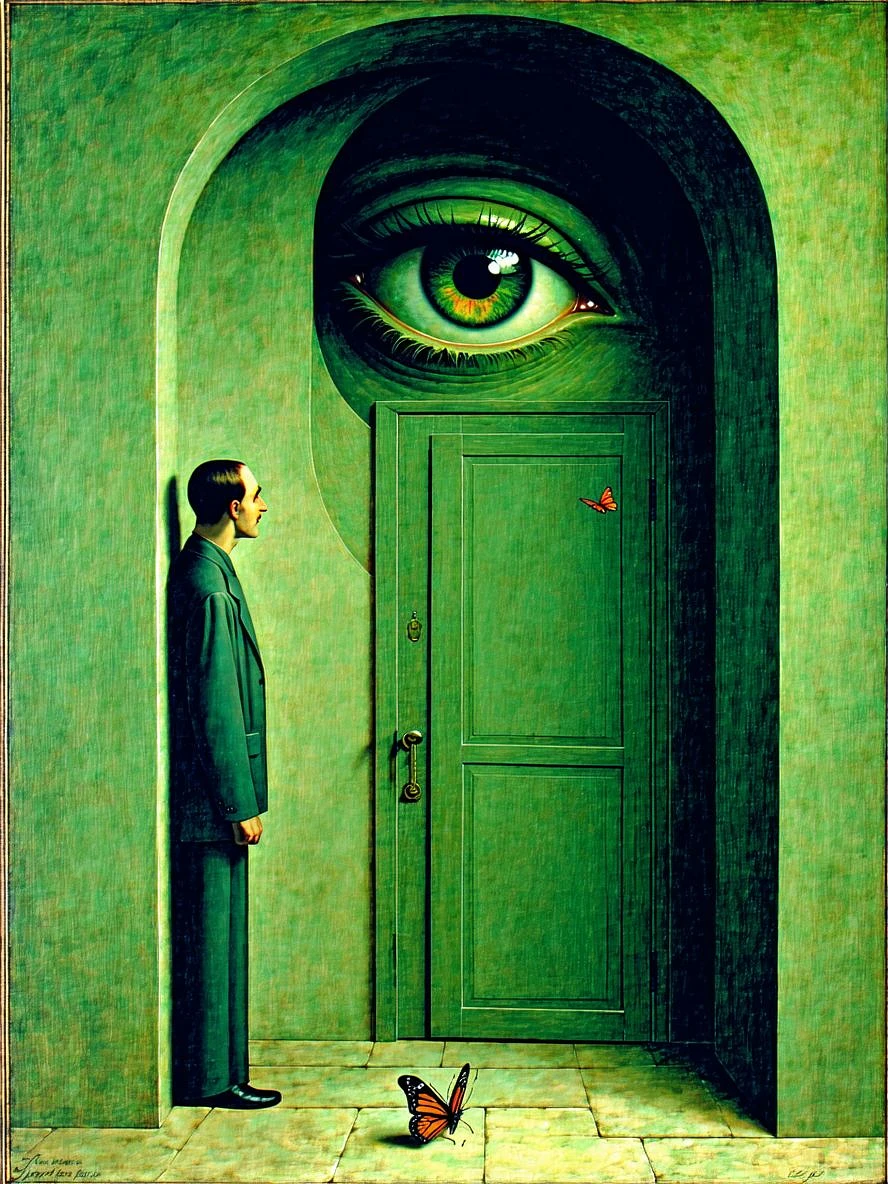 in this surrealist painting by Jan van Eyck a man seems to be lost in a small corridor where an eye looks through the door. meanwhile a small butterfly flies through the scene apparently unaware of the solemnity of the moment.