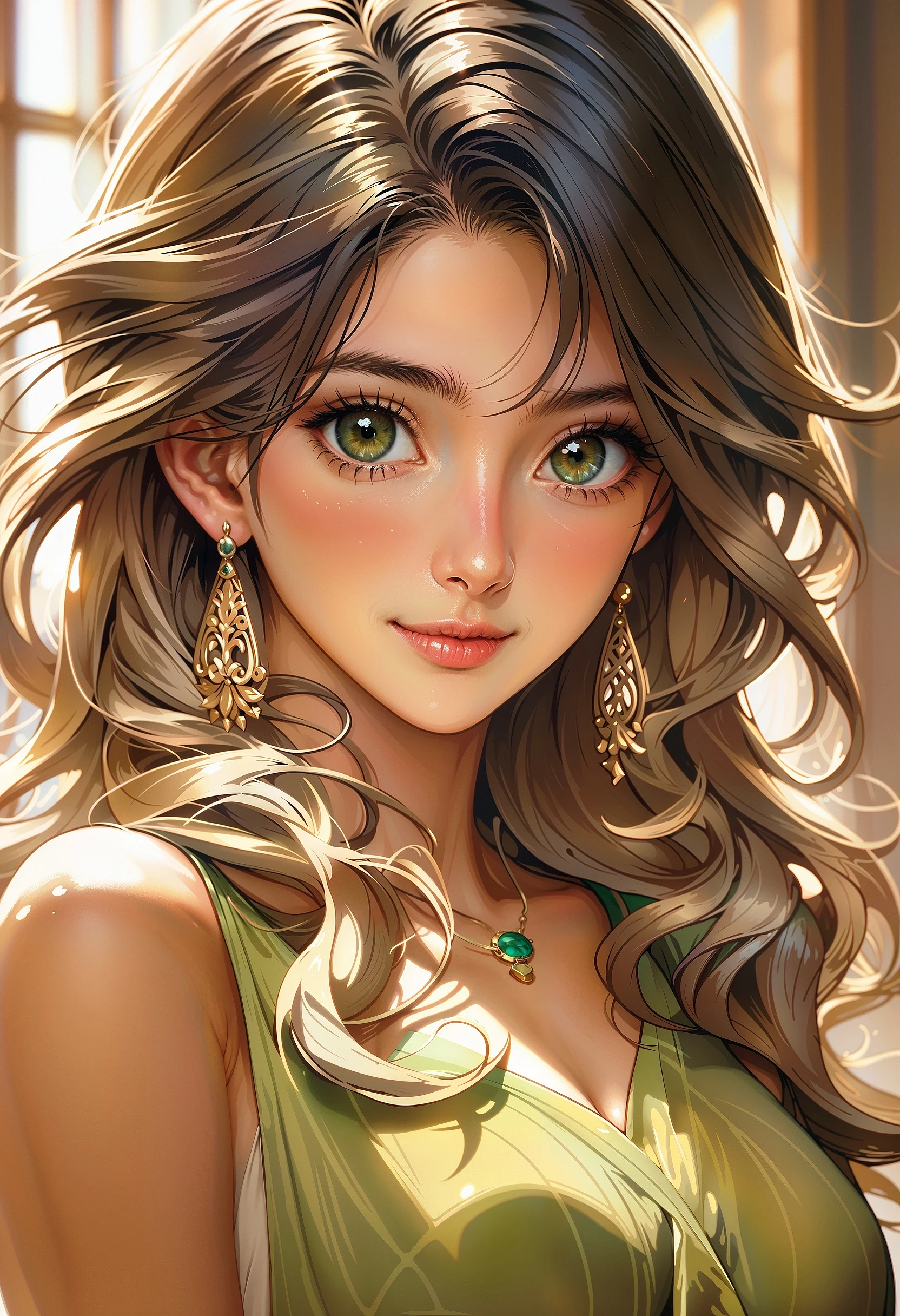 A close-up anime-style portrait of Leni Loud, a cheerful girl with long blonde hair and black eyes, wearing a green sleeveless dress. She stands indoors, her playful smirk adding charm to her expression. Her elegant earrings dangle as she gazes directly at the viewer, her confident pose capturing her lively personality.