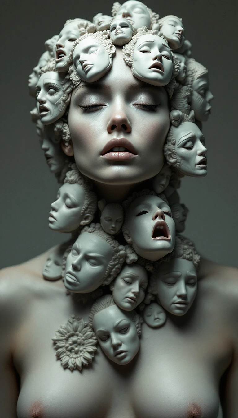 15. An enigmatic, waist-up portrayal of a woman, her face and neck covered in intricately sculpted, ceramic masks, each depicting a different emotion, hinting at the complexity of her inner self and the many faces we choose to show the world. The style merges the detailed craftsmanship of ceramic art with the theatricality of mask performance and the exploration of human psychology.
