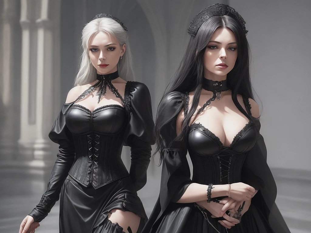 Here is the revised description: The woman in the image is wearing a black leather-inspired ensemble, complete with a fitted bodice and a flowing skirt. The bodice features intricate lacing and silver-toned accents, adding a touch of elegance to the overall design. A matching choker adorns her neck, completing the ensemble. In the background, a gothic provincial medieval castle stands tall, its stone walls and towers rising up into the sky. The castle's architecture is a mix of Gothic and Romanesque styles, with pointed arches, ribbed vaults, and flying buttresses. The castle's walls are adorned with intricate carvings and statues of saints and angels. The woman stands in front of the castle, her dark attire contrasting with the stone walls and the greenery surrounding the castle. She looks confident and poised, her eyes fixed on something in the distance. The overall atmosphere of the image is one of strength and beauty, with the woman's bold fashion statement and the castle's imposing architecture creating a sense of drama and grandeur.