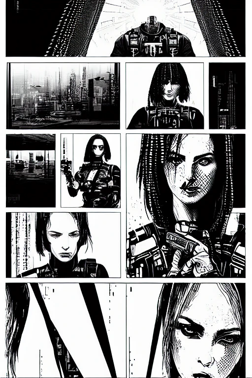 cyberpunk female soldier| cyberpunk 2077| cyberpunk| sci-fi| intricate| precise lineart| highly detailed| centered| hard edge| illustration| by Apollonia Saintclair and Chris Ware
