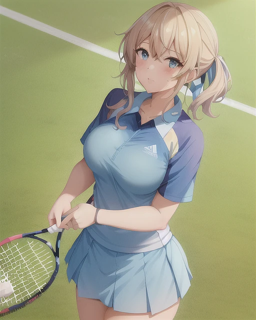 1girl, painting of a girl playing tennis, view from above, outdoors, team uniform, tennis rackets, blue tennis field, trees in background, opponent, clear skies, net in middle of field, celebration, anime, anime face, art by artgerm and greg rutkowski and alphonse mucha, 8k, artgerm anime, professionally color graded, depth of field, hdr, volumetric lighting