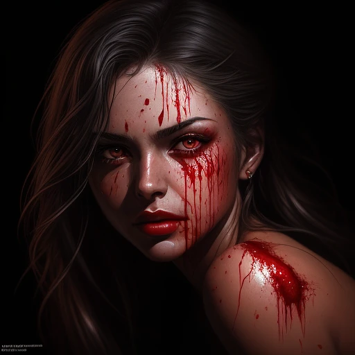 blood drops on a woman's face, shiny eyes, elegant, lovely, dark, dramatic light, in the style of mike deodato, realistic detail, realistic hyper-detailed rendering, realistic painted still lifes