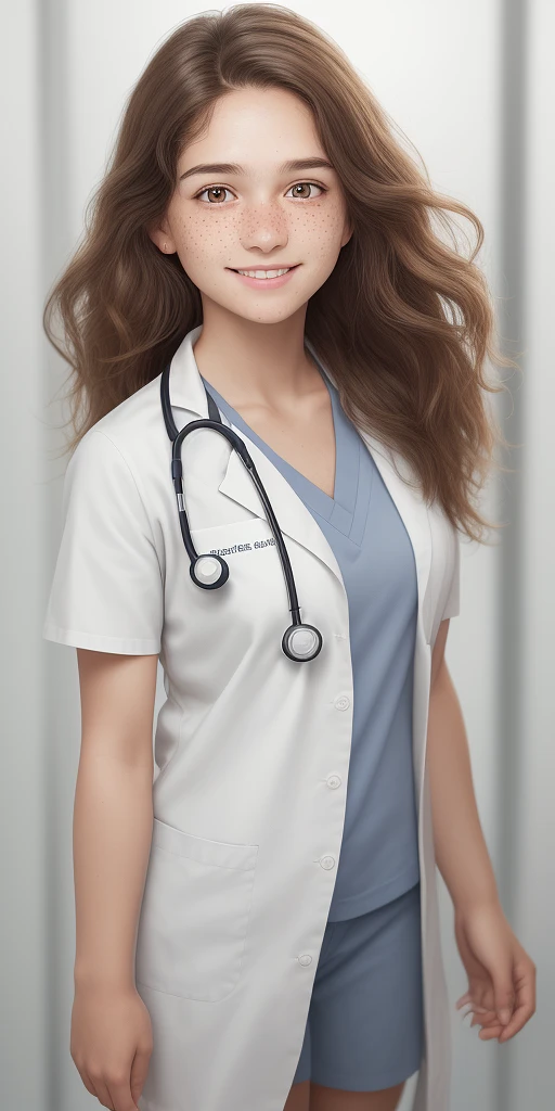 [Three-quarter close-up: :12] , [Smart face, plain brown wavy hair, (fair skin: 1.2) , freckles on the face, soft lighting, simple smile, ((looking at the camera) )) , bright soft eyes: 9], female college student wearing stethoscope ((anatomy: 0.7) , (outfit, medical student) , (location, clinic) , natural gloss, [stunning high-activity uniform rendering:: 30] Max Natural Hair [Ultra Detailed, (Professional Photography, Surreal) , Cinema, Natural Reflective Textures, Natural Materials, High Contrast Shadows, Cinematic Lights, Soft Light): 20], 150mm, ISO 100
