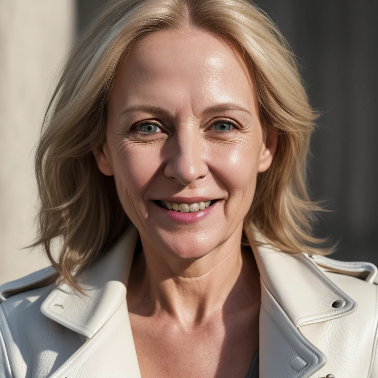 hyper realistic headshot photo of a 45 year old white woman, read leather coat, skinny, looking into the camera, smiling slightly, ultrarealistic, soft lighting, 8k