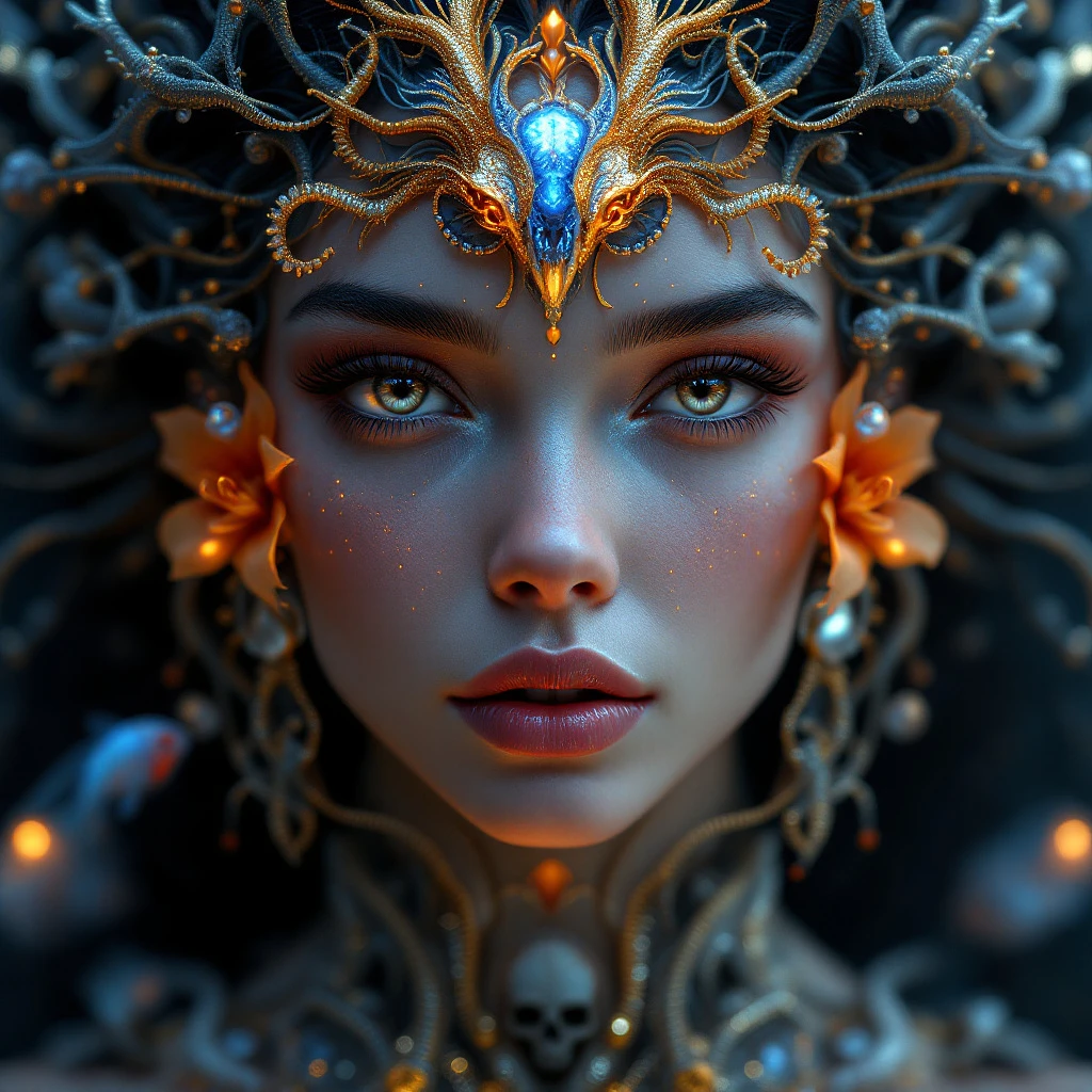 Goddess close-up portrait ribcagel. jellyfish phoenix head, nautilus, orchid, skull, betta fish, bioluminiscent creatures, intricate artwork . octane render, trending on artstation, t symmetrical artwork. cinematic, hyper realism, high detail, octane render, 8k