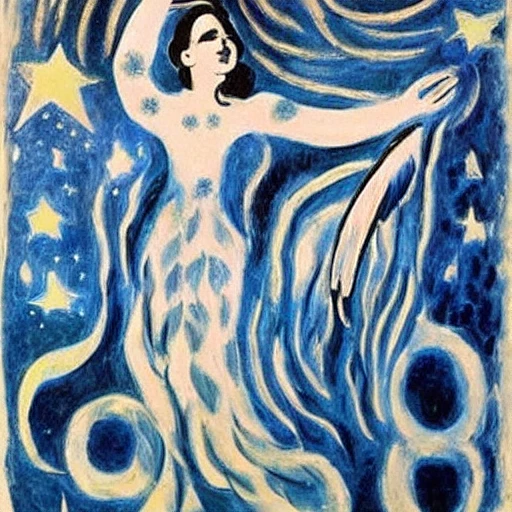 The conceptual art features a woman with wings made of stars, surrounded by a blue and white night sky. The woman is holding a staff in one hand, and a star in the other. She is wearing a billowing white dress, and her hair is blowing in the wind. aboriginal art by Henri Matisse ghostly