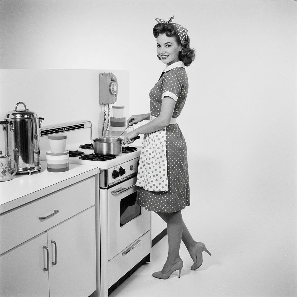 Black and white photo shoot, studio lighting. Old retro pin-up of a beautiful, slim woman of about 18, from the 1960s, Soft natural light, cinematic lighting, bright reflections. Breathtaking setting, photorealism, extreme detail, retro. She's cooking.