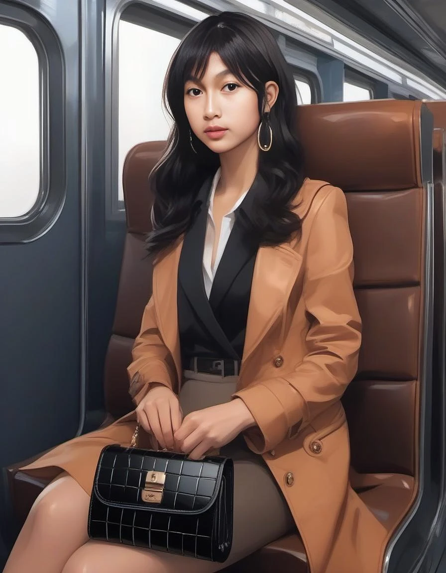 a woman sitting on a train seat with a purse in her hand , anime art, a detailed painting, aestheticism