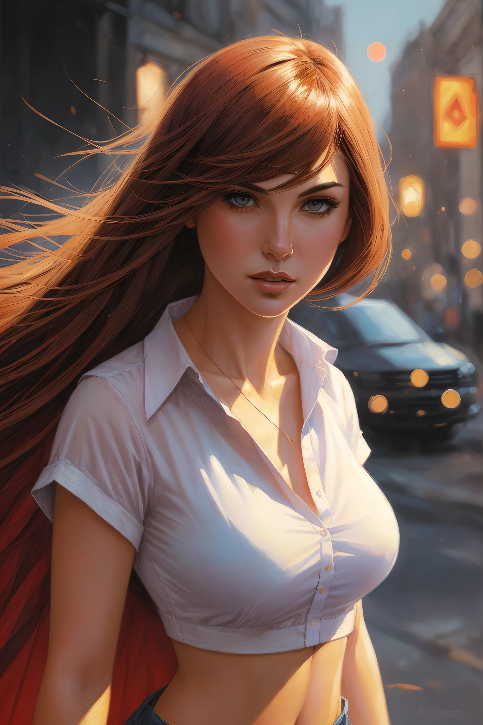 a beautiful comic book illustration of a red-headed woman with white shirt by Jerome Opeña, featured on artstation, 8k, UHD, HDR, (Masterpiece:1.5) , (best quality:1.5)