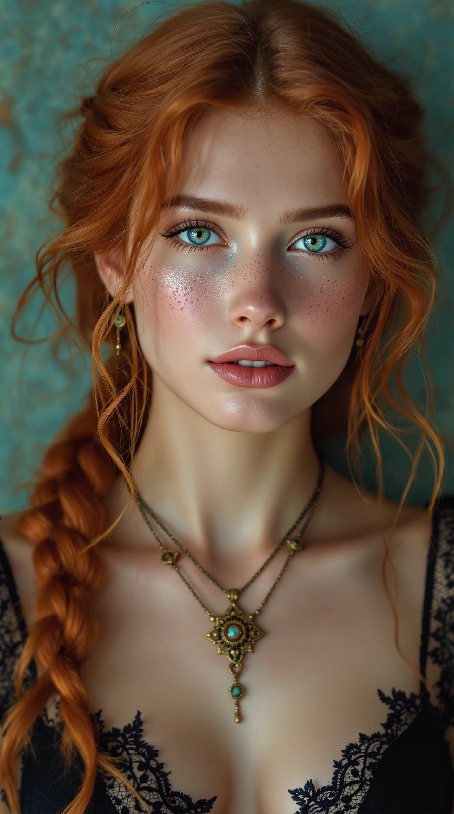 A captivating close-up portrait of a young woman with vibrant auburn hair cascading in soft, natural waves, adorned with delicate braids framing her face. Her radiant green eyes are striking, drawing the viewer in with their depth and intensity. Her face is lightly freckled, with a natural, flawless complexion that glows in the soft ambient light. Subtle glitter accents enhance her cheekbones, adding an ethereal sparkle to her expression. She is wearing two intricate necklaces with a mystical, antique design, the pendants resting gently against her exposed collarbone. Her attire features delicate black lace, blending elegance and mystery. The background is a soft teal hue with a textured, dreamlike quality, complementing her vibrant features. The photorealistic image is rendered in 8k quality, with ultra-detailed textures and lifelike lighting that emphasizes her serene beauty and intricate details.