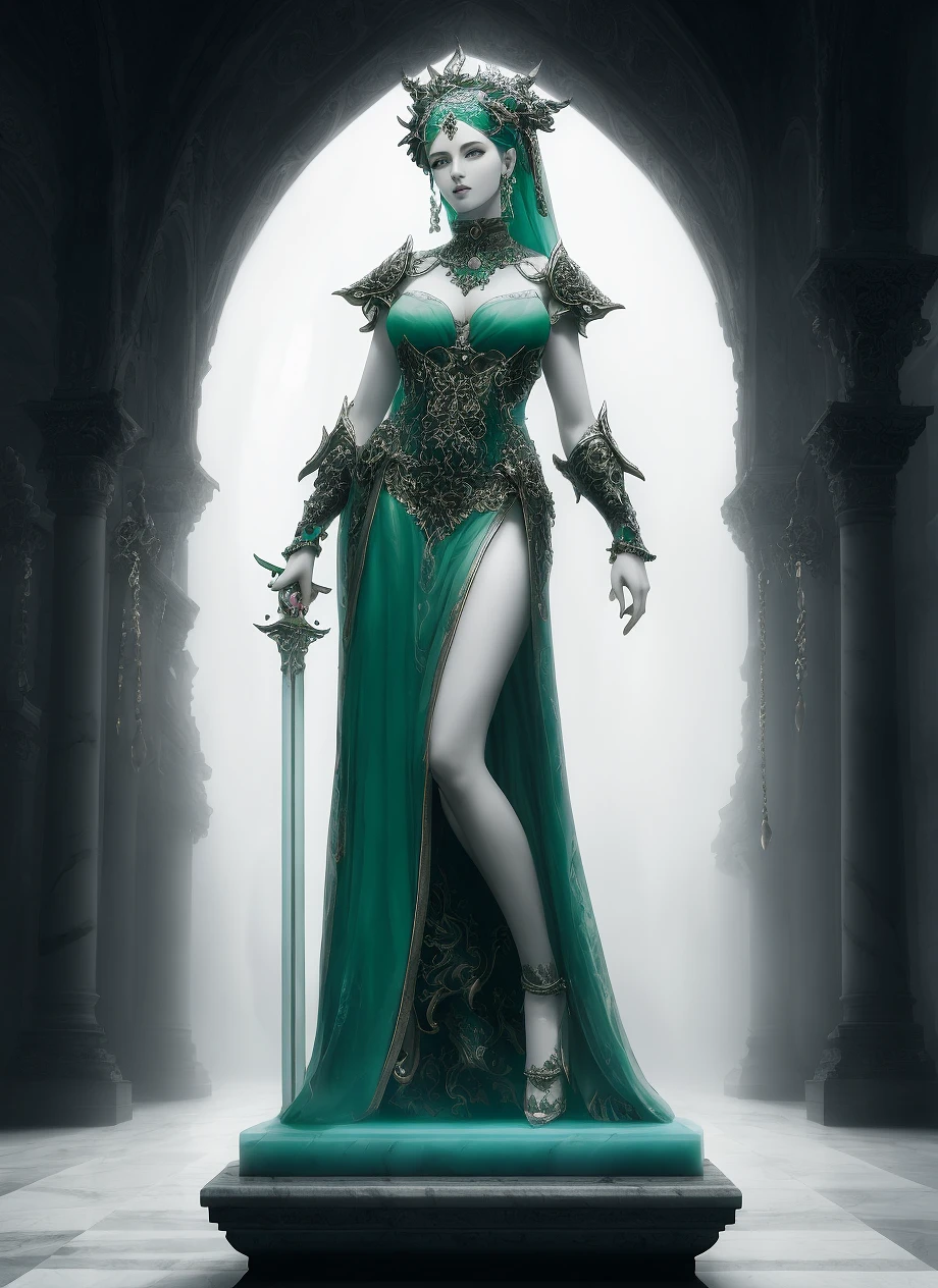 highly detailed marble and jade sculpture of a female necromancer, volumetric fog, Hyperrealism, breathtaking, ultra realistic, unreal engine, ultra detailed, cyber background, Hyperrealism, cinematic lighting, highly detailed, breathtaking , photography, stunning environment, wide-angle