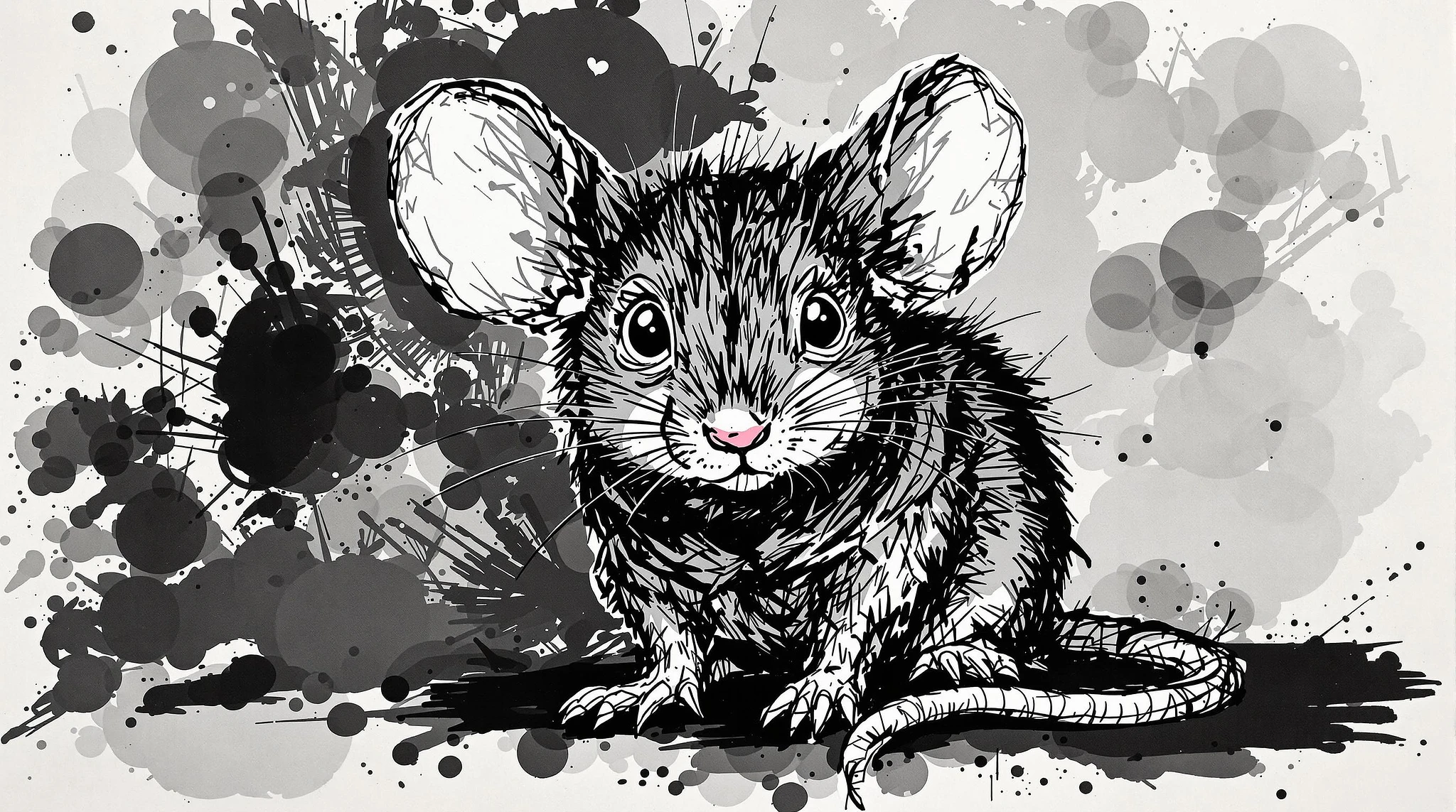 cute Mouse with straight face, detailed, ink style, Ink splash art on the background, ink style, The whole is on the right,Ink wraps around the body, and the ink obscures the subject,Front face