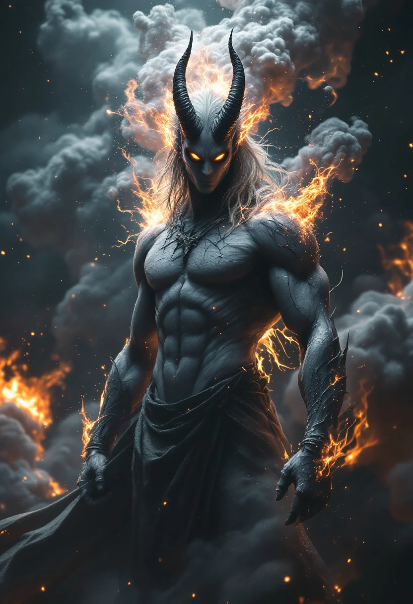 God of Ash, full-body, Etherial, muscular, No mouth or hair, Glowing black eyes, epic, cinematic, 8k, hyper detailed, Ultra detailed, Commanding ash and smoke in space, standing powerfully in a outer space with the fabric of space and time being pulled, small pair of grey horns on the top of his head, photorealistic, unreal engine, octane render, sharp image