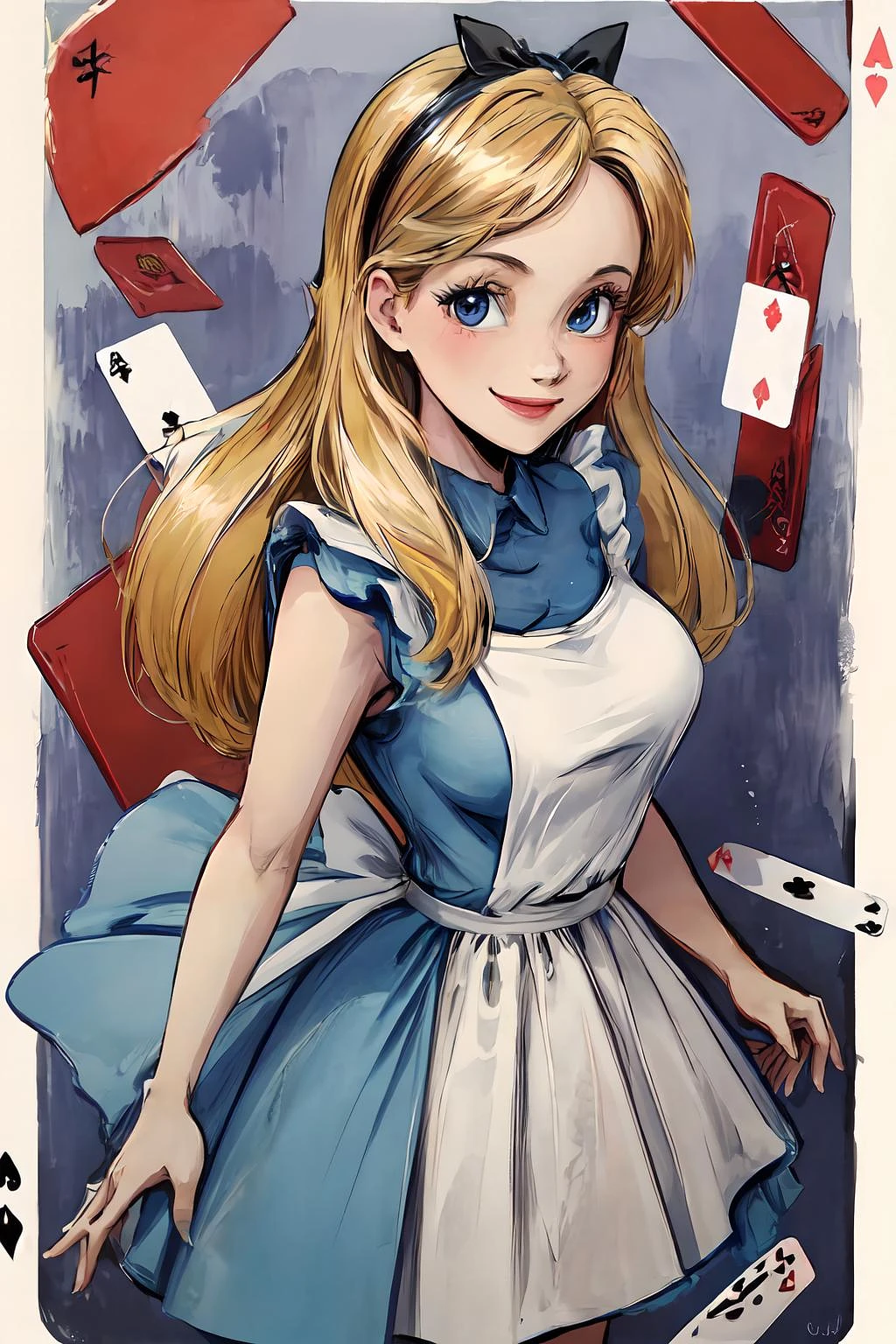 masterpiece, best quality, highres, ultra-detailed, solo, 1girl, <masterpiece, best quality, solo, looking at viewer, front view, smile, <lora:Aliceinwonderland_character-20:0.7> AliceWonderlandWaifu, dress, <lora:add_detail:0.6> large breast, in worderland, have a playing cards