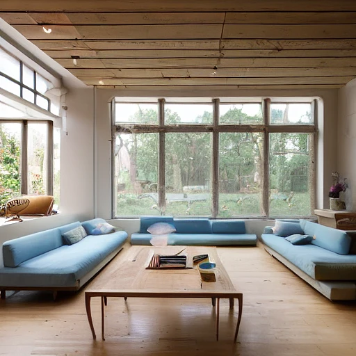 High resolution photography interior design, dreamy sunken living room conversation pit, wooden floor, small windows opening onto the garden, bauhaus furniture and decoration, high ceiling, beige blue salmon pastel palette, interior design magazine, cozy atmosphere; 8k, intricate detail, photorealistic, realistic light, wide angle, kinkfolk photography, A+D architecture