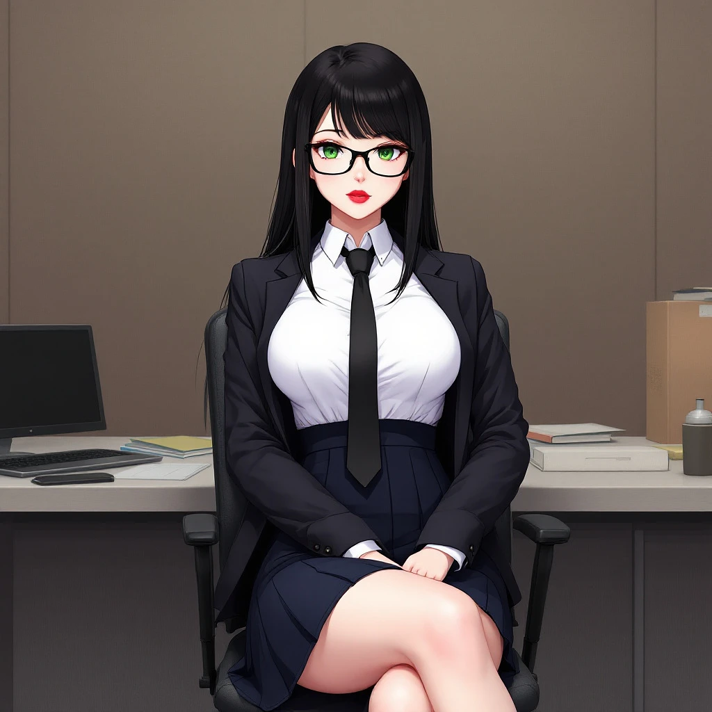 anime, woman, black hair, long hair, green eyes, black glasses, red lips, white shirt, black tie, black blazers, short dark blue skirt, highschool skirt, white socks, black shoes, standing at an office, big chest, sitting on a chair, sitting with legs crossed