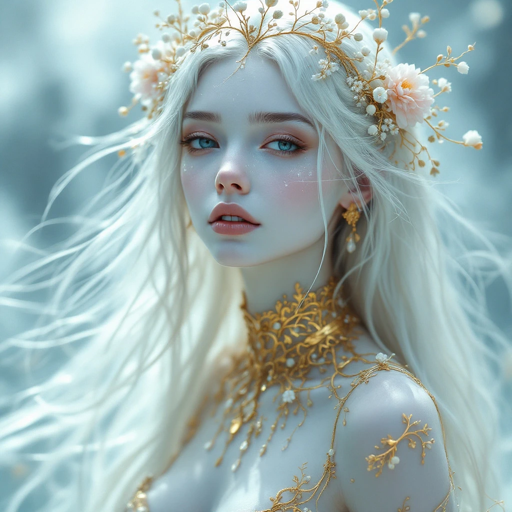 A beautiful ethereal creature with long flowing white hair and delicate features is adorned with intricate golden jewelry and a crown of delicate flowers. The intricate design of the jewelry resembles delicate branches and leaves, creating a sense of nature and beauty. The creature's skin is smooth and pale, with a slight blue tint, suggesting a connection to the water or sky. She has a gentle expression, and her eyes are open, as if lost in a dream. The background is a soft blur of blue and white, creating a dreamy and ethereal atmosphere. The entire image is filled with delicate details and intricate patterns, creating a sense of wonder and magic.
