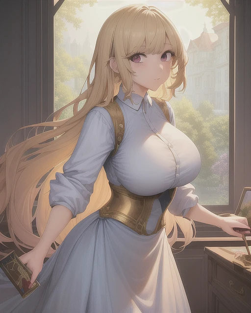 A beautiful creative girl painting with a palette and paint board. The girl has realistic attributes like a natural hair color and mansion. The painting is anime, professionally color graded, 8k HDR, vivid, bright, anime faces, hyper resolution, depth of field, and created by Artgerm, Greg Rutowski, and Alphonse Mucha with volumetric lighting. The painting has very bright colors and uses anime faces that are not distorted.