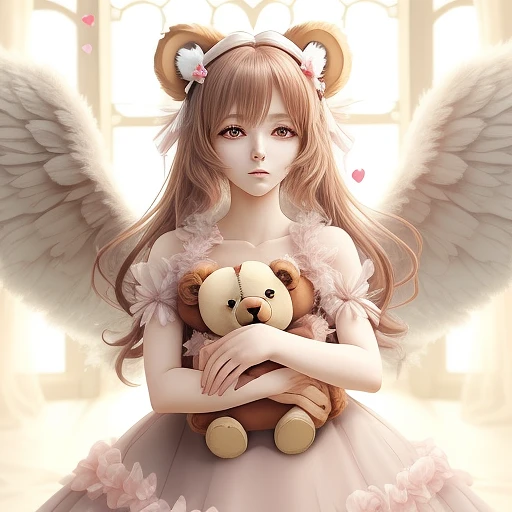 A beautiful mesmerizing female anime human with teddy bear ears and wings carrying a heart in a really beautiful gown