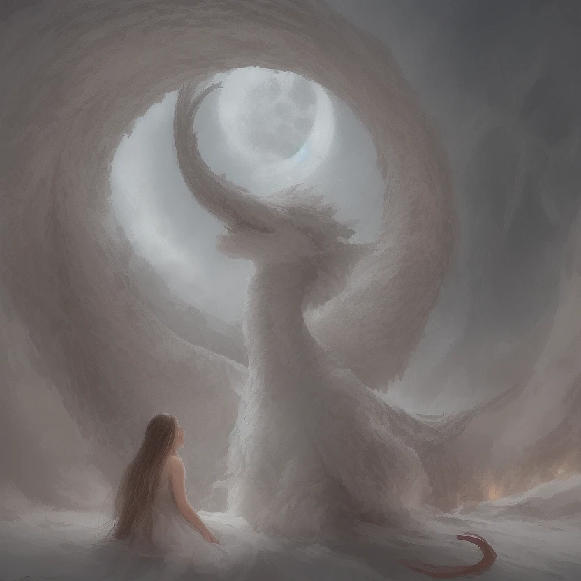 The image depicts a woman in a white dress standing in front of a large dragon, with a full moon in the background. The woman has long brown hair and is wearing a long, flowing white dress that appears to be made of a lightweight material. The dragon is massive, with its head and neck filling the right side of the image. It has glowing red eyes and sharp teeth. The background of the image is a dark, cloudy sky with a full moon shining brightly through the clouds. The overall style of the image is fantasy, with a focus on the dramatic and mystical elements of the scene.