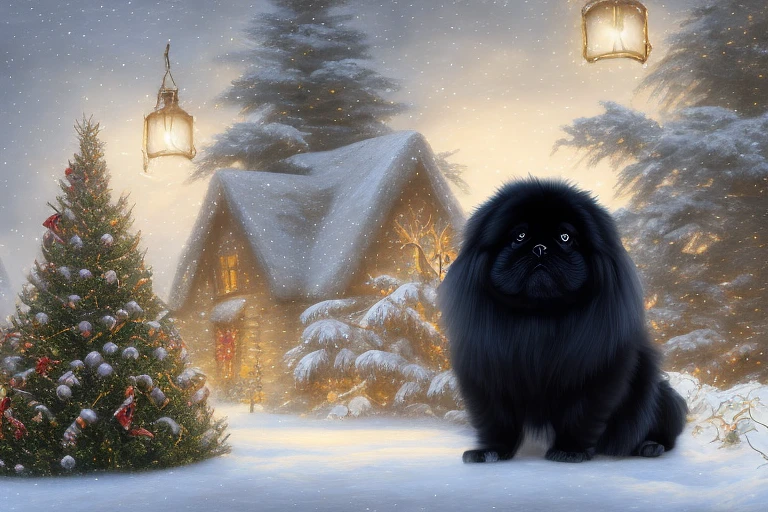 big black Pekingese dog, big black eyes, long fluffy hair. in a snowy wood, snow covered cottage with warm light, christmas tree with lights, christmas scene, Hyperdetailed oil painting, artwork, fantasy, intricate, cinematic lighting, photo realistic, oil painting, intricate artwork