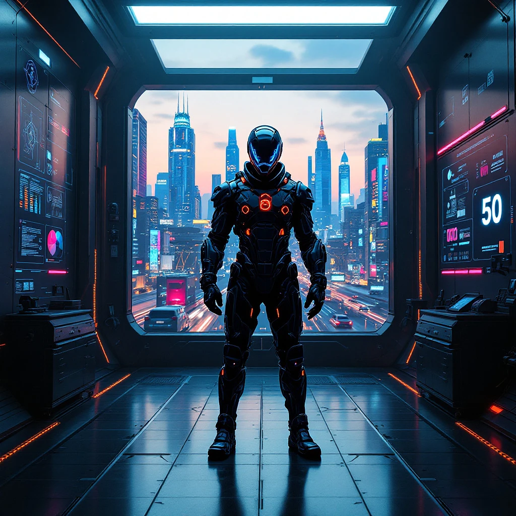 Imagine a sleek, futuristic workshop nestled deep within a sprawling cityscape at dusk. The environment is an advanced forge designed for high-tech craftsmanship, illuminated by a blend of neon and soft ambient lighting. The walls are crafted from matte black, heat-resistant composites, adorned with holographic schematics and digital displays that flicker with data. Large, reinforced windows reveal a skyline filled with towering skyscrapers shimmering with holographic advertisements and flying vehicles streaking by. The floor is a polished, dark metallic surface with embedded LED strips guiding pathways and tool stations. At the center stands the forger, an imposing figure clad in a high-tech, form-fitting suit reinforced with armor plating and subtle glowing accents in electric blue and crimson. Their helmet features a sleek visor with augmented reality displays, giving a full view of digital blueprints and real-time diagnostics. The forger’s hands are encased in gloves with integrated tools—precision welders, laser cutters, and nano-assemblers—ready to shape complex machinery or mythical constructs. Behind them, a large workbench hosts an array of advanced tools, robotic arms, and partially assembled artifacts glowing with energy. Nearby, shelves contain exotic materials: shimmering alloys, luminous crystals, and dark, obsidian-like substances. The environment exudes a mix of high-tech precision and creative chaos—scattered digital sketches, glowing circuits, and metallic debris. The air hums with a faint energy, hinting at the immense power harnessed within. The overall look is both sterile and dynamic, blending cutting-edge technology with artisanal craftsmanship, creating a scene that embodies innovation, mastery, and a relentless pursuit of perfection. This setting captures the essence of a futuristic forge—where science and art converge in a luminous, high-tech sanctuary.