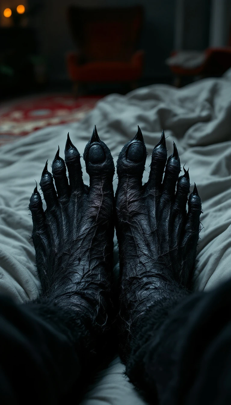 POV first-person, I am a jinn lying on my bed in my room. Only my feet are visible in the frame. My feet look like a dog's but more unsettling. They are covered in rough, black fur, with long, bony toes ending in thick, sharp, dirty claws. The skin beneath the fur appears dry and cracked, giving them an eerie, unnatural look. My toes twitch slightly, as if restless. The room has a modern Iranian decor—minimalist yet warm, with a Persian rug on the floor and traditional elements blended with contemporary furniture. The dim lighting casts eerie shadows, making the strange shape of my feet even more pronounced.