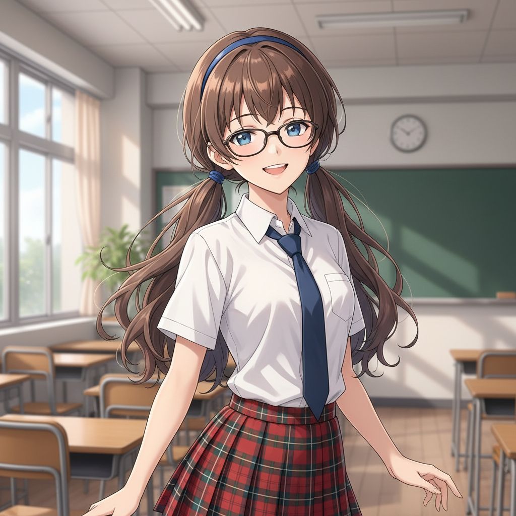 marimakinami, mari makinami, long hair, brown hair, twintails, (low twintails:1.1), hairband, blue hairband, blue eyes, (parted bangs:1.1), smile, skirt, necktie, plaid, glasses, opaque glasses, indoors, classroom, looking at viewer, (cowboy shot:1.1), (masterpiece:1.2), best quality, high resolution, unity 8k wallpaper, (illustration:0.8), (beautiful detailed eyes:1.1), extremely detailed face, perfect lighting,(perfect hands, perfect anatomy), perfect lighting, full body, sexy, porn, nsfw.