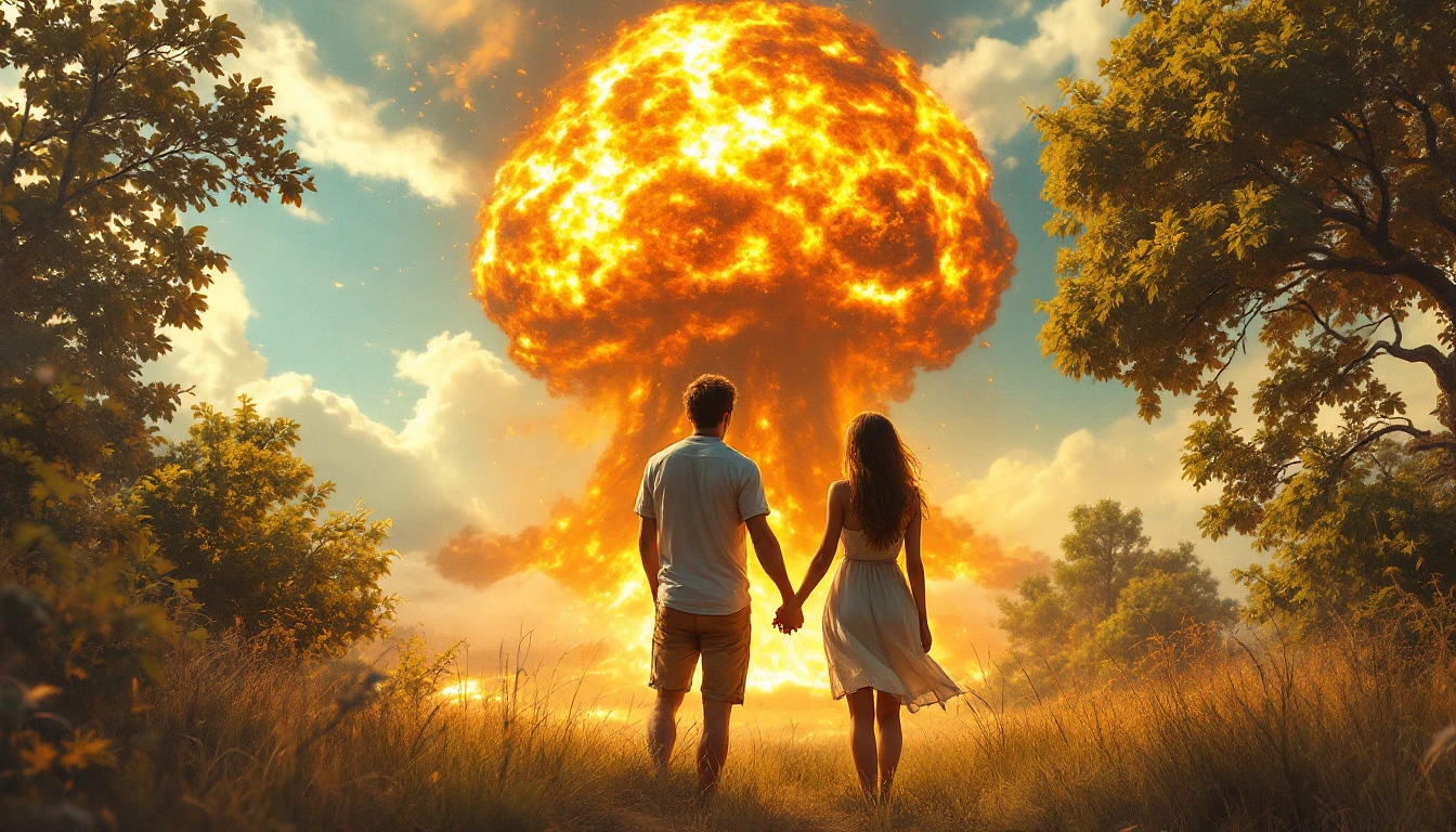 summer. A guy in shorts and a girl in a light dress, holding hands. and looking in the distance at a nuclear explosion. trees on fire
