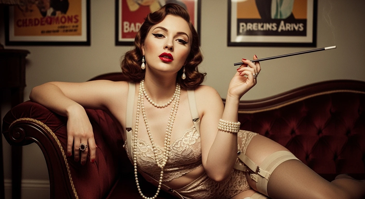 Pin-up photography: A sultry woman in her 30s with a curvaceous figure, styled in a vintage 1930s pin-up look, wearing delicate lace underwear, stockings, and suspenders, soft curls framing her face, bold broght red lips, Long Pearl Necklace, and winged eyeliner, reclining on a velvet chaise lounge, retro posters in the background, cigarette holder in hand, sultry gaze at the camera, warm cinematic lighting, soft focus, shot from a slightly low angle, captured with a Hasselblad 500CM, Kodak Ektar 100 film, 50mm lens, subtle sepia tone, by Gil Elvgren.